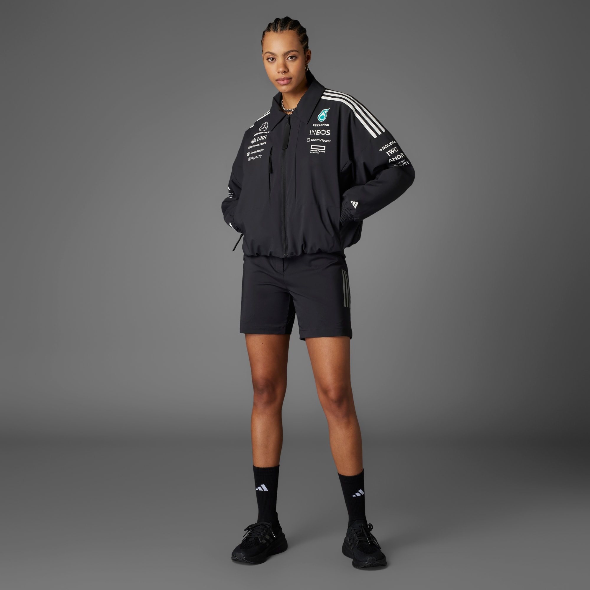Una campera oficial de adidas Motorsports hecha parcialmente con materiales reciclados