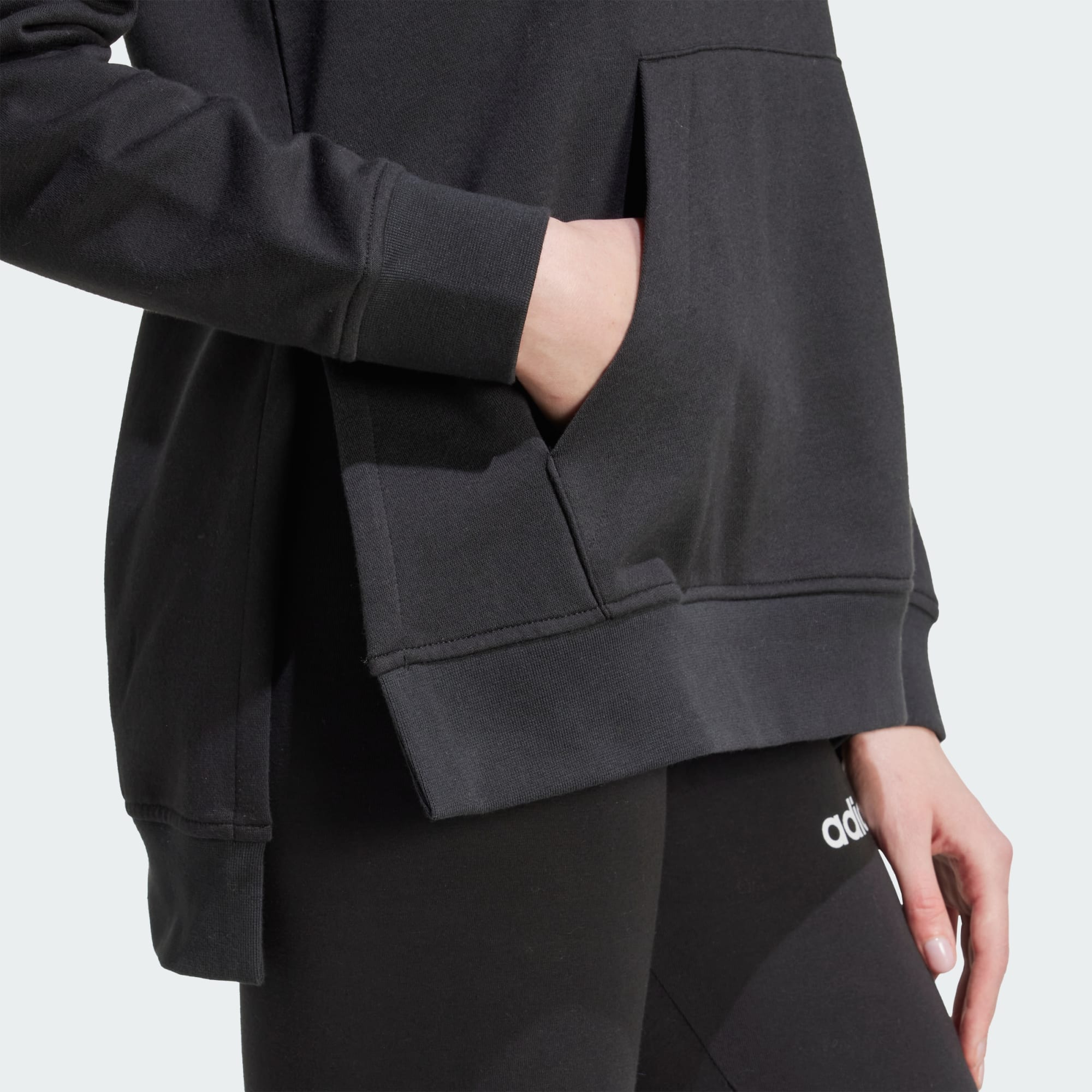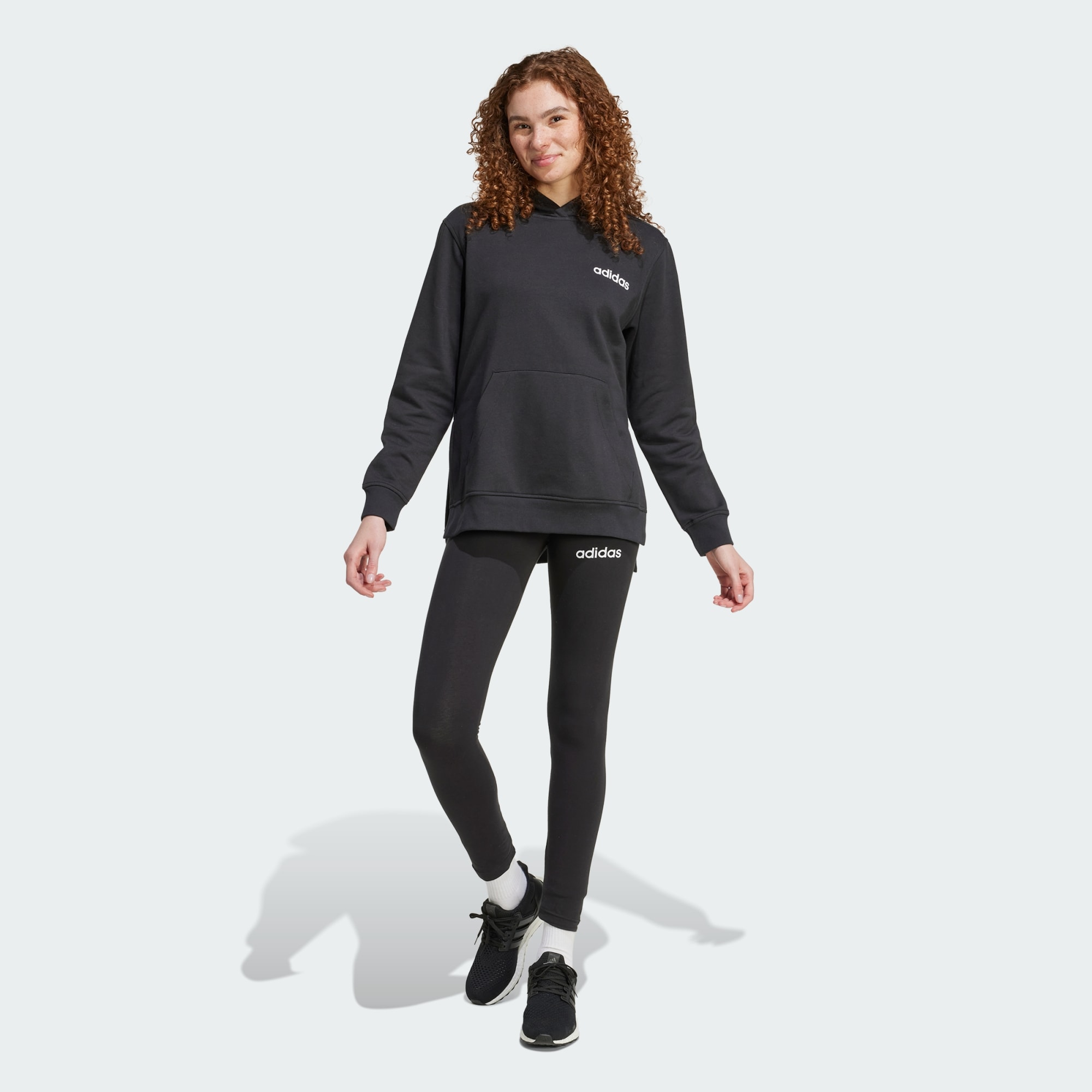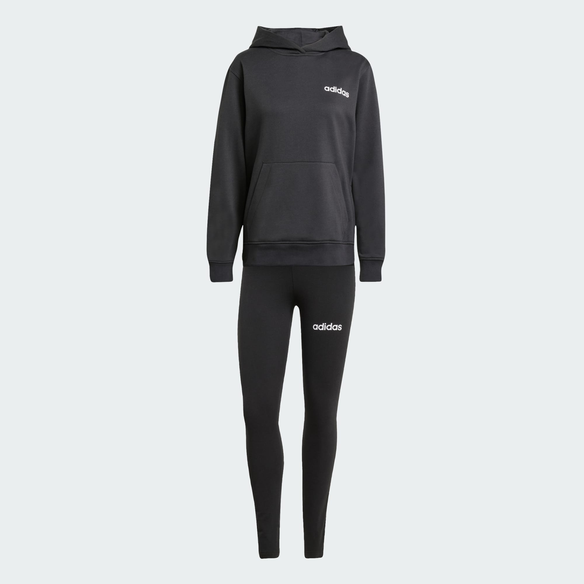 Despreocupate de tu vestimenta diaria con este conjunto deportivo adidas. La combinación incluye un buzo con capucha de corte holgado con aberturas extralargas en los dobladillos laterales, una amplia capucha y un espacioso bolsillo tipo canguro. Las calzas a juego tienen un tacto suave y cómodo, ideal para los días de paseo o las noches en casa.