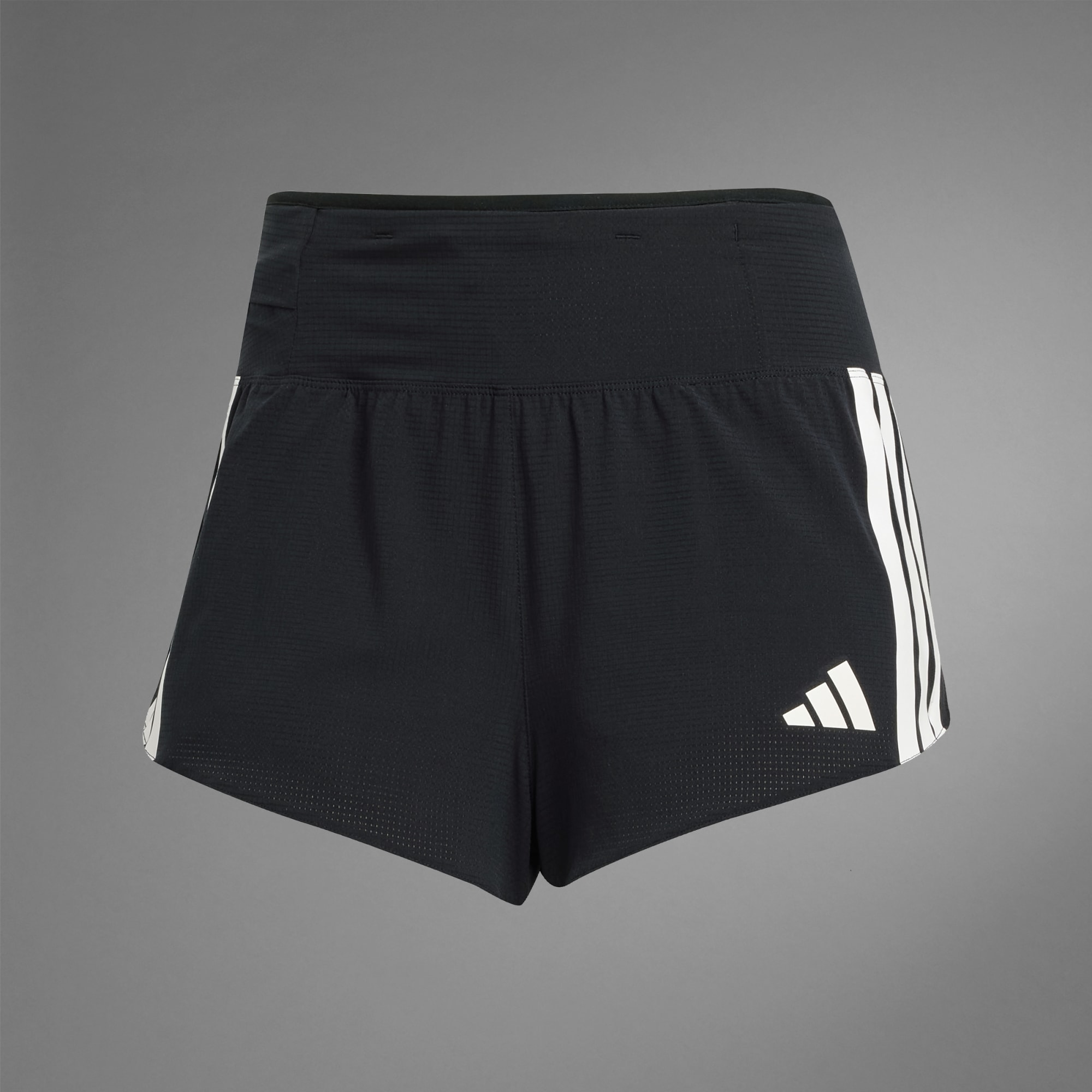 The image shows a pair of white and black athletic shorts with the text "ADIZERO GEL POCKET SHORT" printed on them.